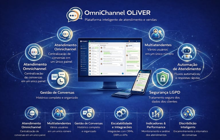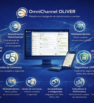 O OmniChannel Oliver é uma plataforma completa de atendimento omnichannel, desenvolvida para centralizar, organizar e profissionalizar a comunicação entre empresas e seus clientes em múltiplos canais, com foco principal no WhatsApp.