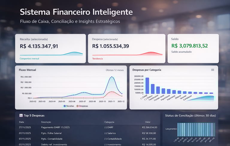 A solução oferece controle completo de fluxo de caixa, dashboards gerenciais, gestão de lançamentos financeiros e conciliação bancária, centralizando informações estratégicas em uma única plataforma.